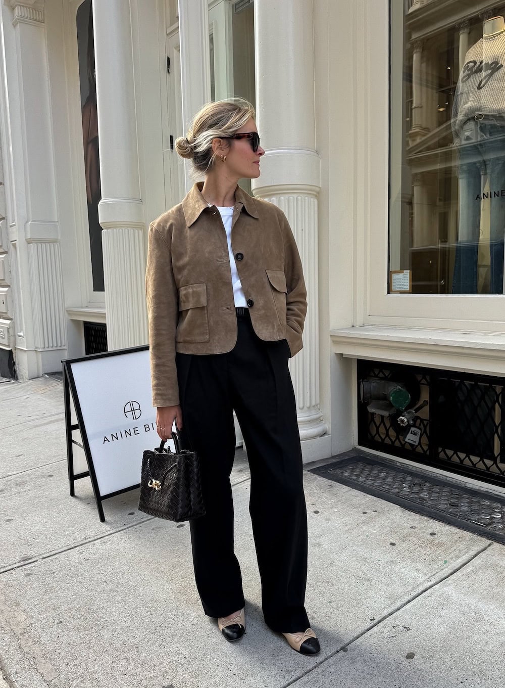 Achieving that coveted “effortlessly put-together” look is made easy with this stylish suede coat. This piece is not only a perfect layer for unpredictable spring days, keeping you warm without being too heavy, but it also remains a strong trend for Spring 2026. Paired with cap-toe ballet flats, the ensemble offers a timelessly chic silhouette. This outfit is ideal for various occasions, whether you’re heading to a professional setting or meeting friends for coffee in the East Village.