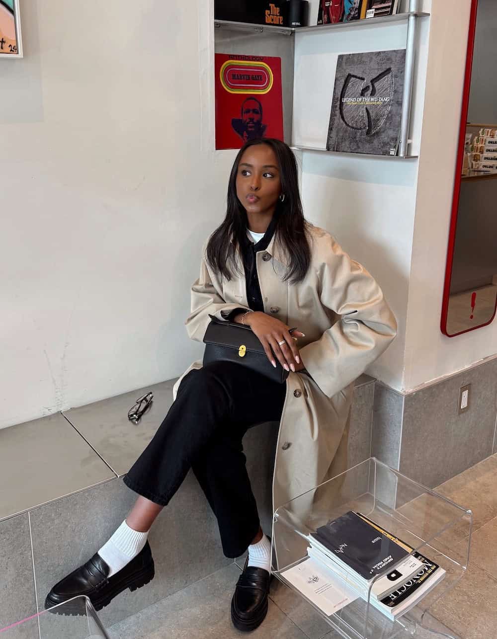 For those who aren’t ready to abandon their darker winter palettes for spring, a chic black-on-black ensemble offers a sleek and sophisticated option. This monochromatic look is inherently New York and perfect for cooler spring days. A classic trench coat adds seasonal relevance, while chunky loafers provide a trendy, comfortable, and stylish finish, making this outfit suitable for anything from navigating a rainy day to enjoying a relaxed evening out.