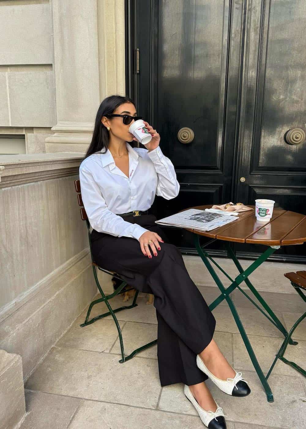 For outfits suitable for the workplace or semi-formal daytime engagements, the classic pairing of a white button-up shirt with black slacks is a fail-safe choice. This timeless combination is not only comfortable but also highly adaptable for accessorizing. Neutral cap-toe flats add a touch of feminine flair and subtle contrast to this polished ensemble.