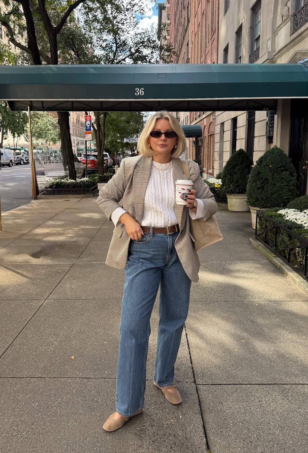 This outfit embodies the essence of effortless elegance, serving as an excellent transitional look for early spring. A comfortable knit sweater paired with blue jeans forms a classic base, while a patterned blazer adds visual interest and personality. Cozy flats ensure comfort, making this ensemble perfect for daytime city activities or a day at the office.