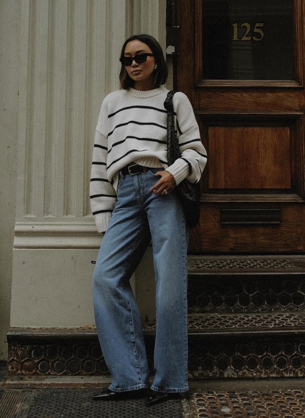 Striped patterns are a perennial favorite for spring, and this look beautifully merges chic Parisian charm with relaxed New York style. The outfit is both simple and timeless, making it ideal for a casual coffee date before heading to an event or simply enjoying a stroll through the city.