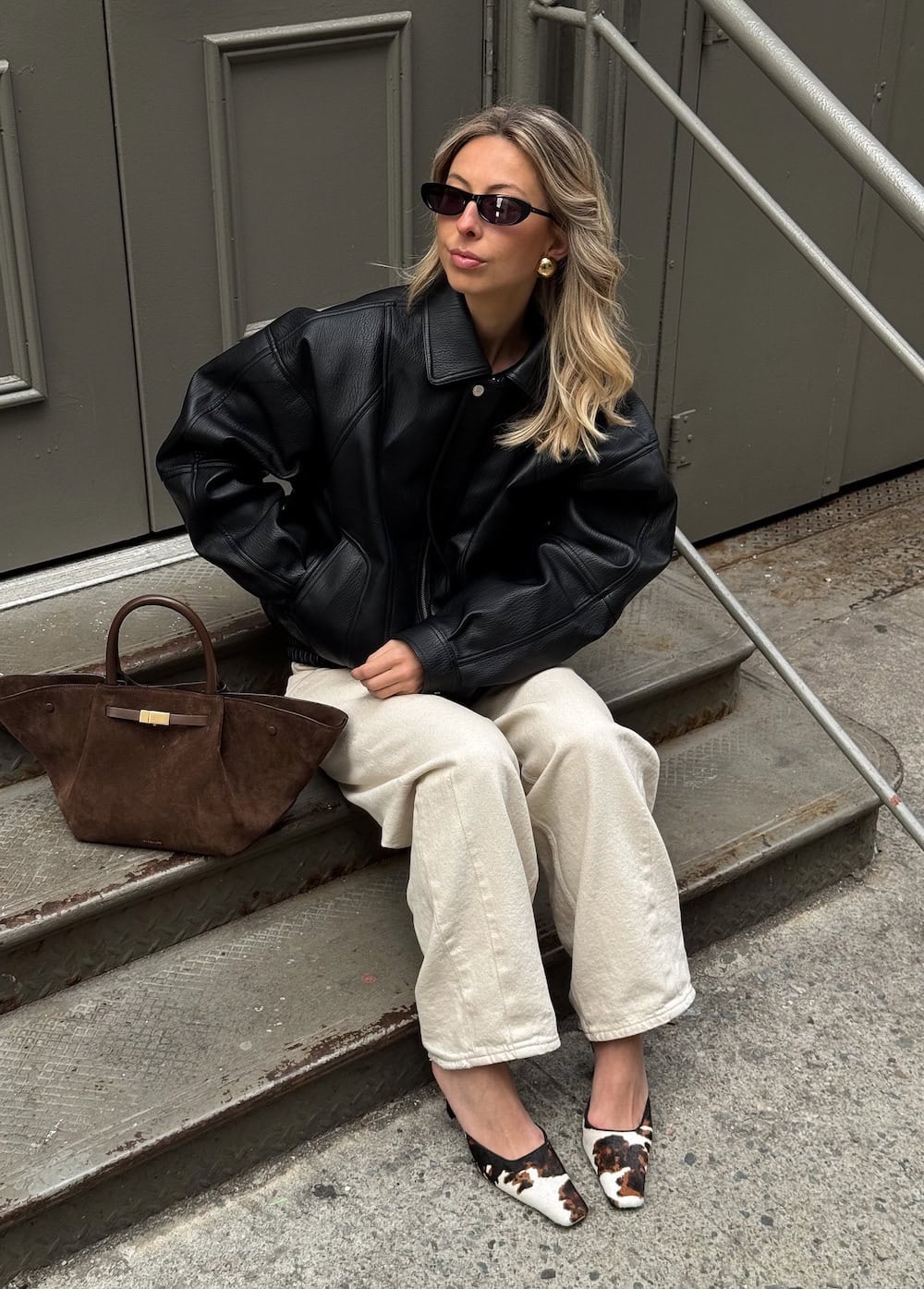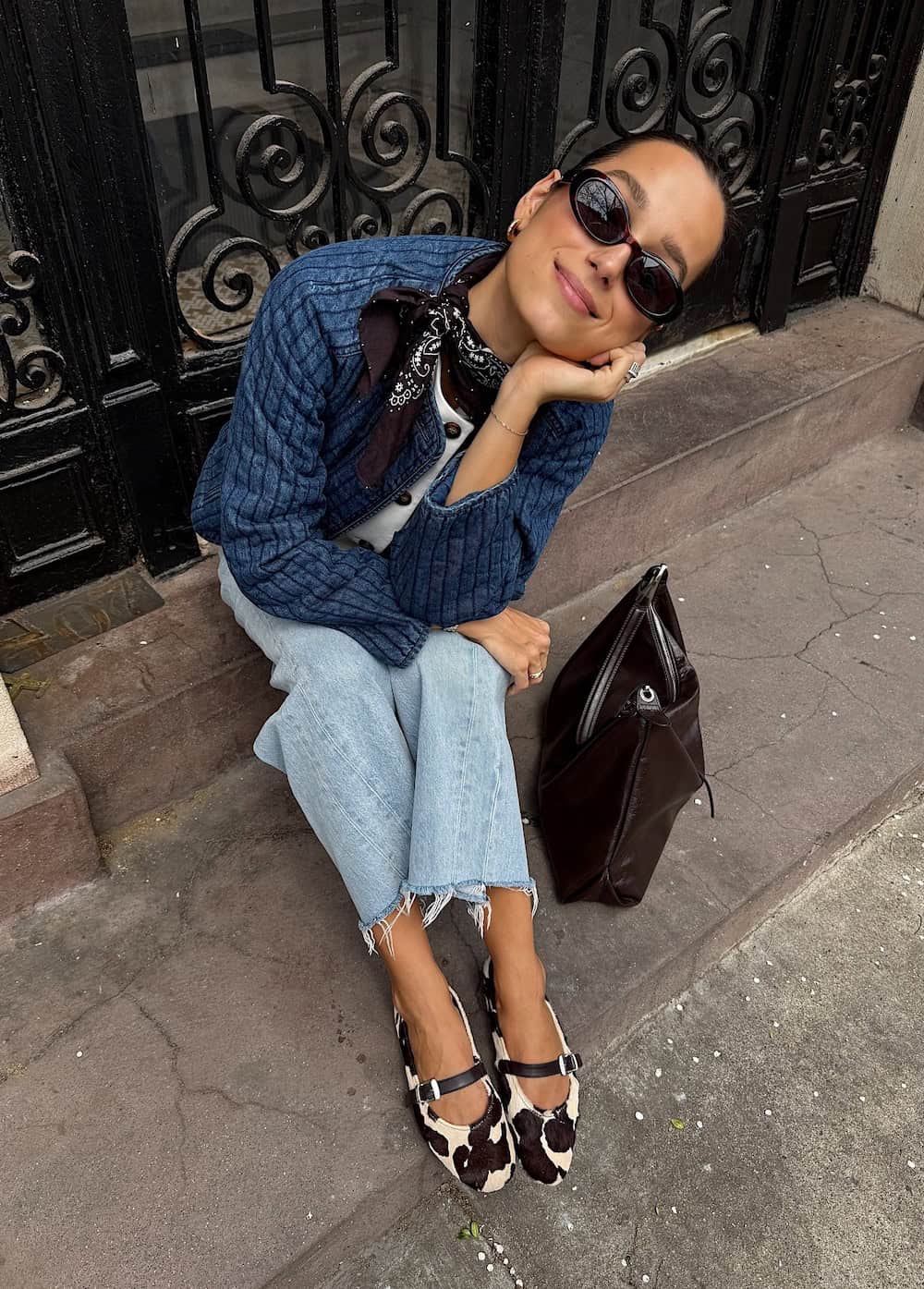 This ensemble masterfully balances neutral denim with eye-catching accessories. A leather jacket lends an air of cool-girl chic, ideal for fluctuating spring temperatures, while cow-print heels add a touch of feminine personality. This outfit is a fantastic choice for a romantic evening or drinks with friends at a rooftop bar.