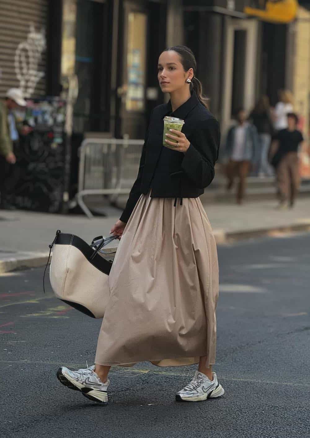 Nailing the urban New Yorker style is expertly demonstrated here with a sophisticated blend of a flowing midi skirt and a sharp, cropped blazer. This pairing creates a refined and stylish silhouette, while the addition of sneakers ensures practicality for navigating the city streets. The outfit strikes a perfect balance, appearing elevated without being overly formal, and its versatility makes it suitable for numerous settings across the city.