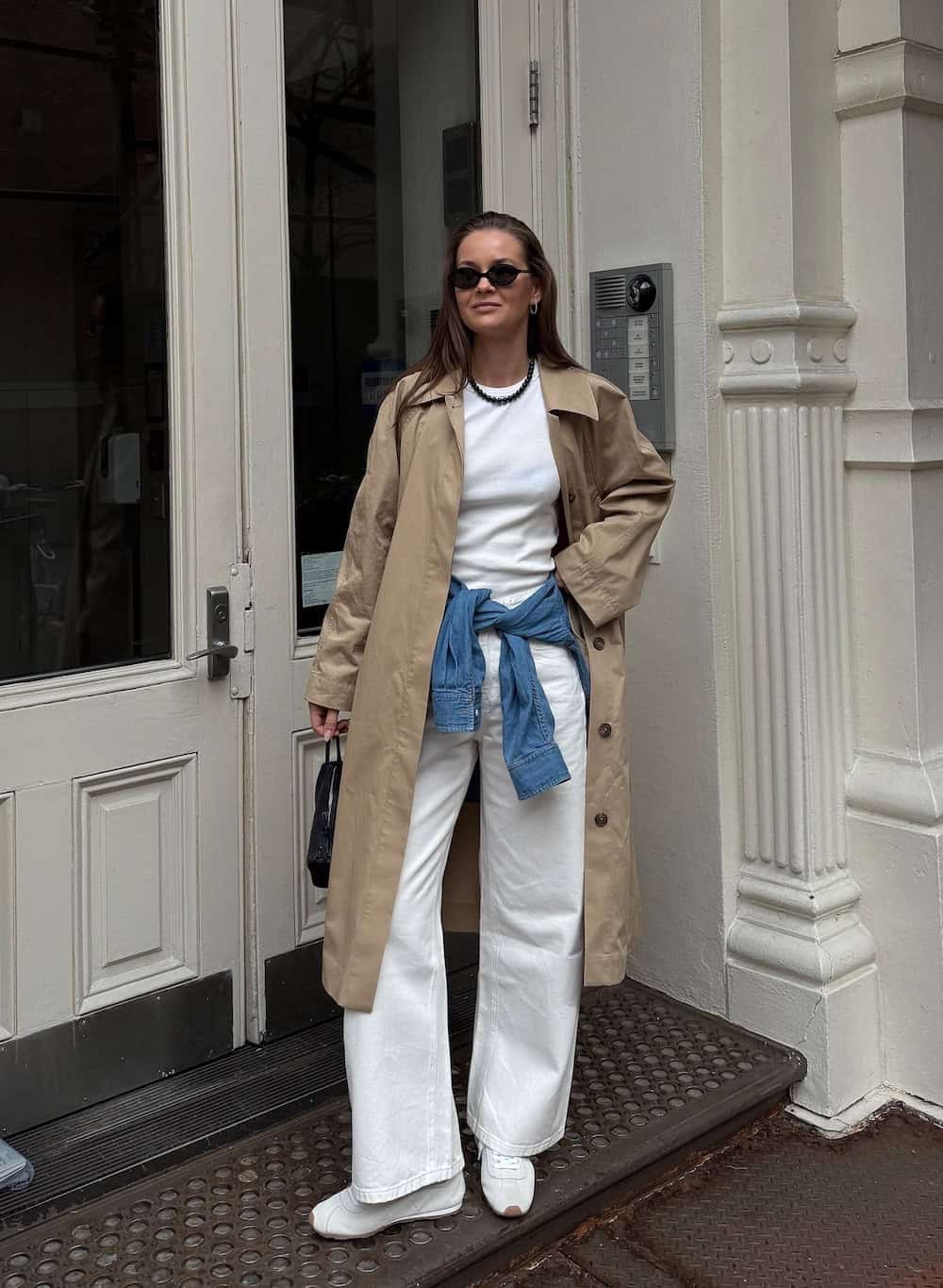 This outfit, perfect for early spring days, is characterized by its clean and functional aesthetic. An all-white base offers a fresh and chic foundation, easily adaptable to personal style. The addition of a denim layer provides extra warmth if needed, while a long trench coat offers protection from unexpected rain. Minimalist sneakers complete the look, ensuring you can traverse the city in style.