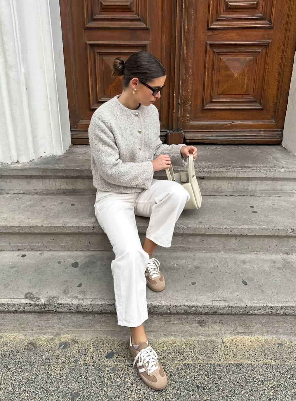 Mastering the “off-duty model” aesthetic involves a neutral color palette and minimalist pieces for a clean, contemporary look. Comfortable, sleek sneakers are essential for days filled with walking, while ivory denim and an elevated cardigan provide warmth for crisp spring mornings. These easily combined pieces create an appearance that is both effortlessly chic and modern.