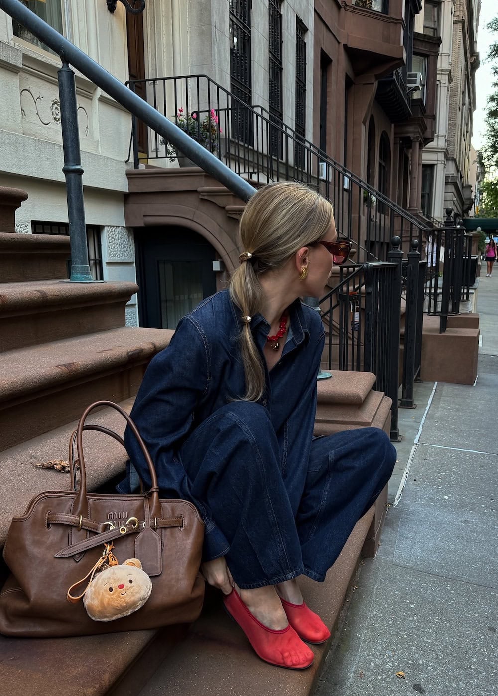 The classic combination of denim on denim gets a contemporary update with the addition of sheer red ballet flats. This unexpected footwear choice injects a bold pop of color and modern flair into the ensemble. Complementing this with other red and gold accents elevates the look, making it suitable for a range of activities, from visiting art galleries to enjoying casual dinners or simply spending the weekend exploring the city.