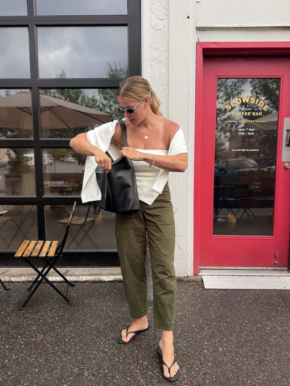 Army green bottoms paired with a simple white strapless tank create a visually appealing contrast, harmonizing an earthy tone with a feminine top. Layering a fine-knit sweater over the shoulders adds an effortless and sophisticated touch to this ensemble. Completing the look with simple sandals and a sleek shopper tote makes it ideal for a day of shopping, enjoying iced lattes, or simply taking advantage of pleasant weather.