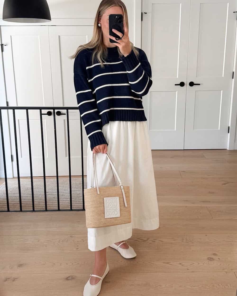 The combination of a crisp white poplin skirt and a striped white-and-navy sweater evokes a subtle coastal charm, perfect for a seaside stroll or simply channeling a relaxed, nautical vibe. A straw tote bag serves as the ideal accessory to complete this effortlessly chic, breezy, and polished ensemble, suitable for summer vacations, weekend getaways, or embracing a vacation mindset.