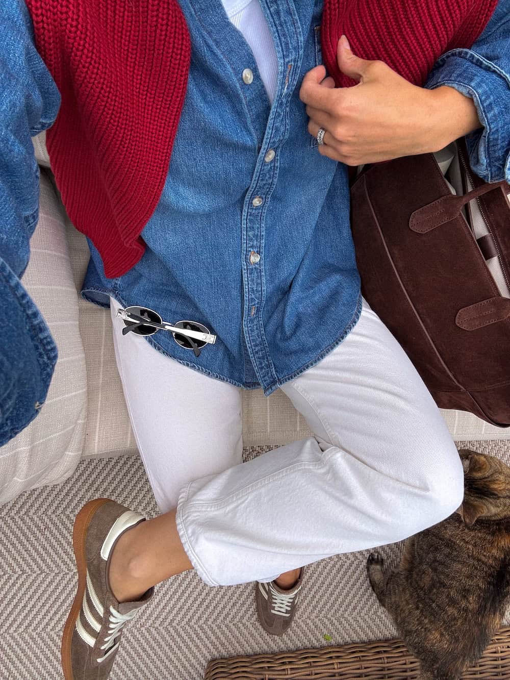 For those transitional days in early June when the weather is not yet at its peak heat, this ensemble is a perfect choice. Ivory denim paired with a simple white tank top offers a light and breezy foundation, with the option of linen or cotton blends enhancing breathability. The addition of a denim overshirt provides an excellent layer for cooler mornings or unexpectedly breezy evenings. Consider adding a pop of unexpected color, like a red sweater draped over the shoulders, to make the outfit feel more intentional and visually engaging. Ground the look with classic, neutral sneakers.