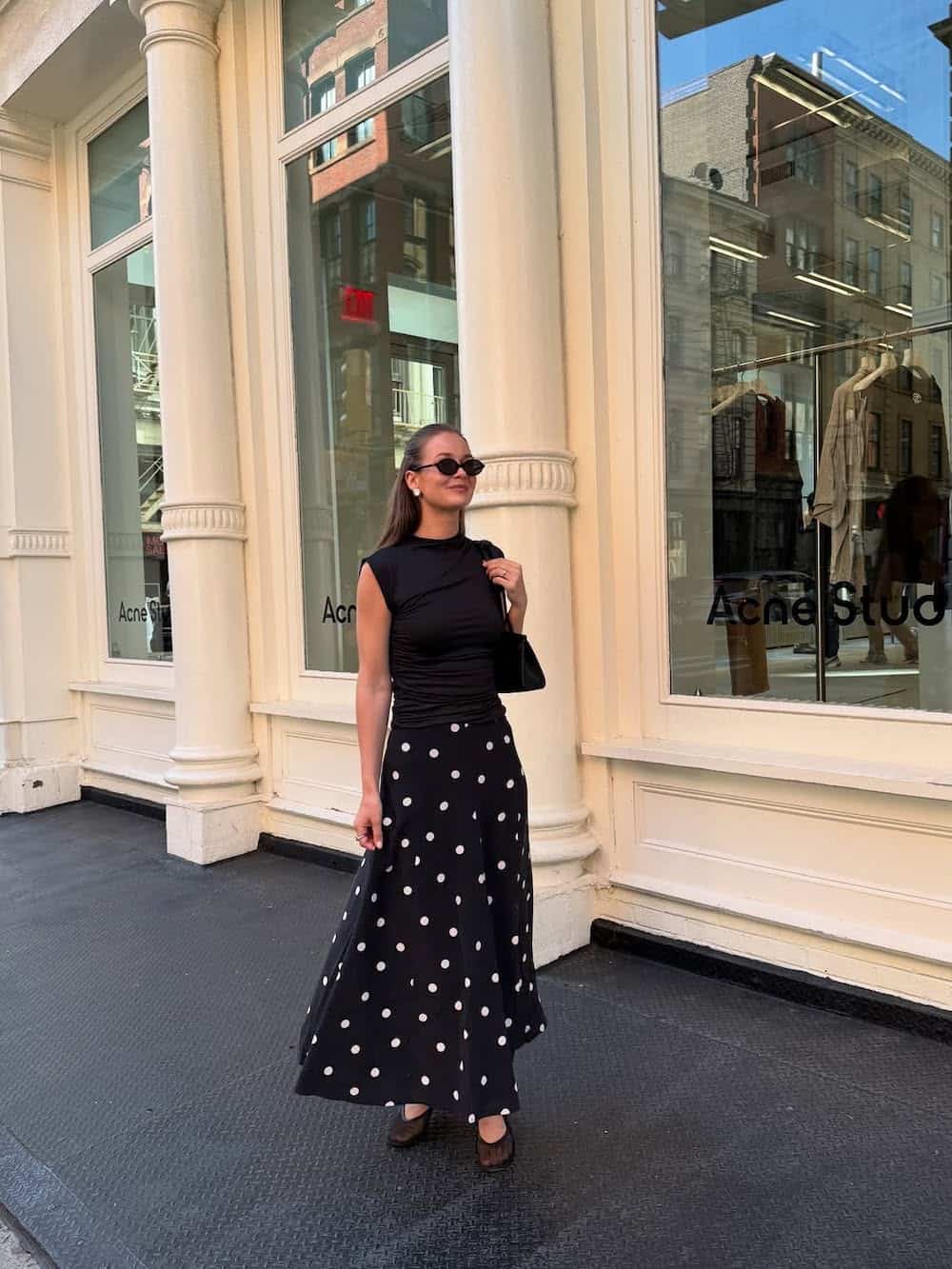 A black-and-white polka dot midi skirt paired with a sleek, high-neck tank offers an effortlessly timeless and sophisticated outfit. The playful print adds personality, while the fitted top keeps the look modern and feminine. The addition of sheer black ballet flats provides a delicate and on-trend textural element. This ensemble is perfect for summer lunch dates, exploring art galleries, or navigating a new city in style, masterfully blending classic charm with contemporary trends.