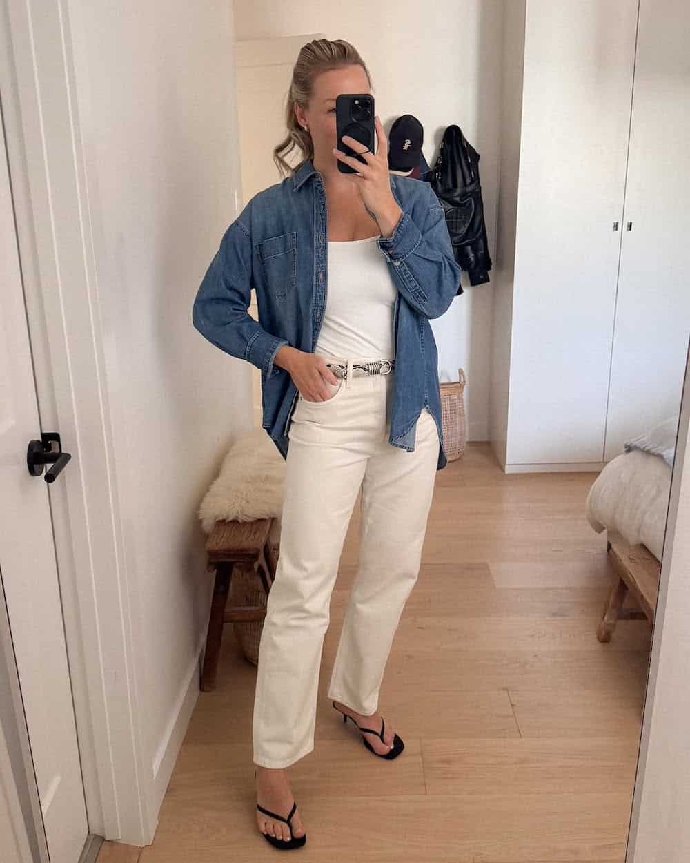 A clean, crisp base outfit serves as an excellent starting point for creating summer looks. Layering a blue denim overshirt over lighter tones effectively breaks up the palette and introduces an effortless, summery vibe. This style is particularly suitable for early summer, and the addition of black kitten heels provides a classy touch, making it perfect for casual lunch dates with friends or family.
