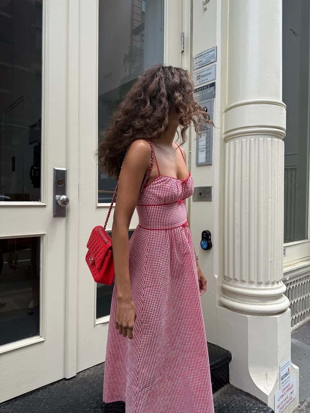 Embrace a soft, romantic, and alluring summer look by opting for a white-and-red gingham dress, complemented by a statement quilted purse. This outfit is playful, feminine, and full of charm, making it an excellent selection for park outings, brunch dates, and other June activities.