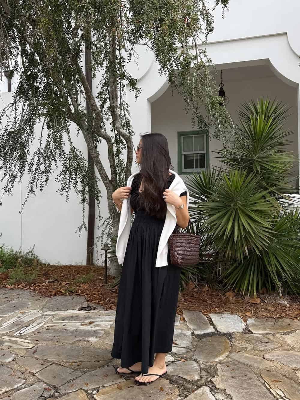 For an easy yet elegant June outfit, consider a black midi dress layered with a simple sweater draped over the shoulders. This styling adds visual interest through contrast, even within a neutral color palette, and creates a look that is both feminine and practical for warm summer days.