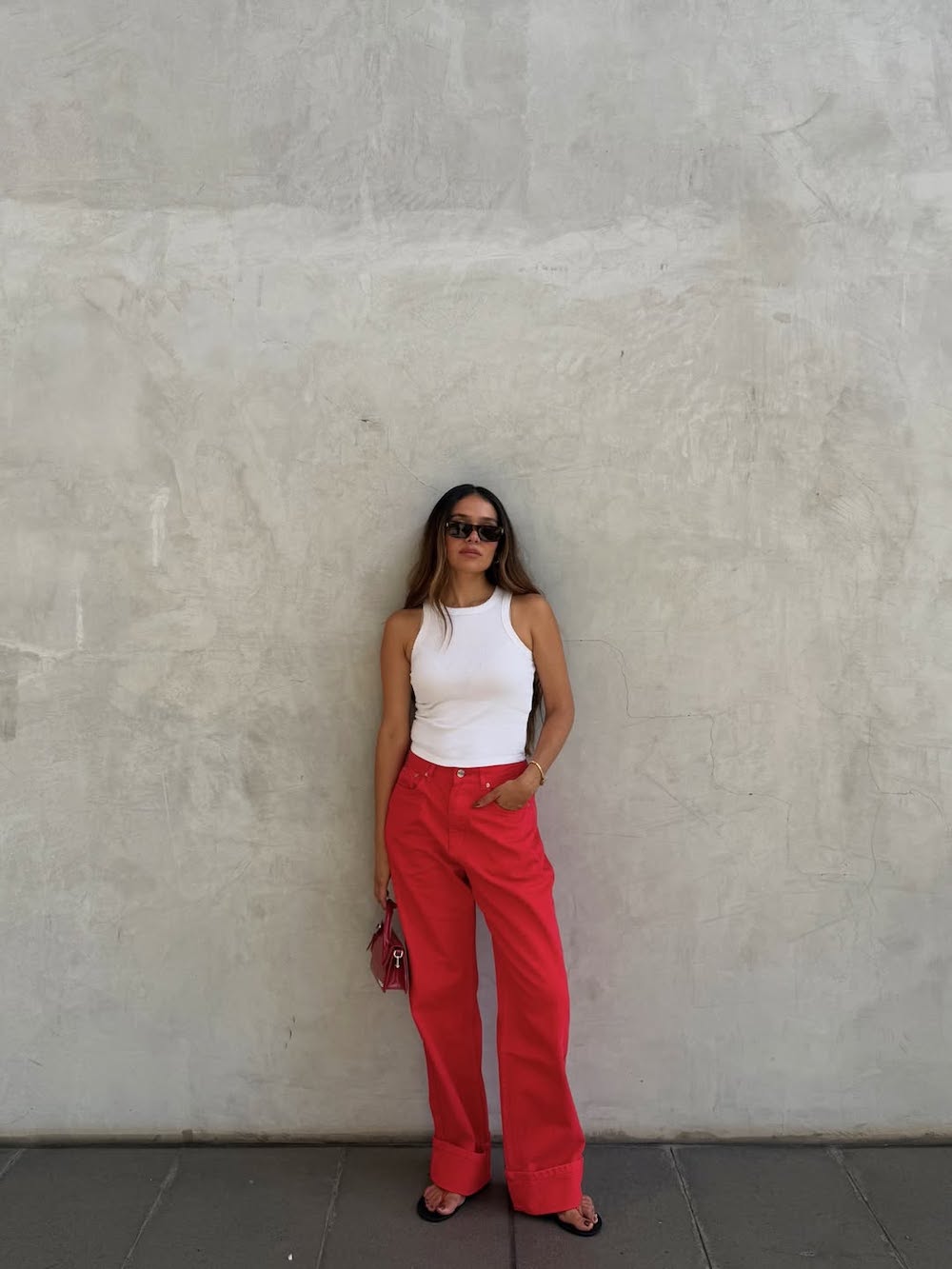 Bold red shades are making a significant statement in 2026, and summer is the ideal season to embrace this captivating color. A vibrant red piece, like the one shown, paired with a simple white tank and minimalist thong sandals, creates a look that is both striking and effortlessly cool. Adding a red handbag elevates the ensemble, providing a polished and intentional touch. This outfit is perfect for enjoying a delightful brunch or browsing a lively street fair.