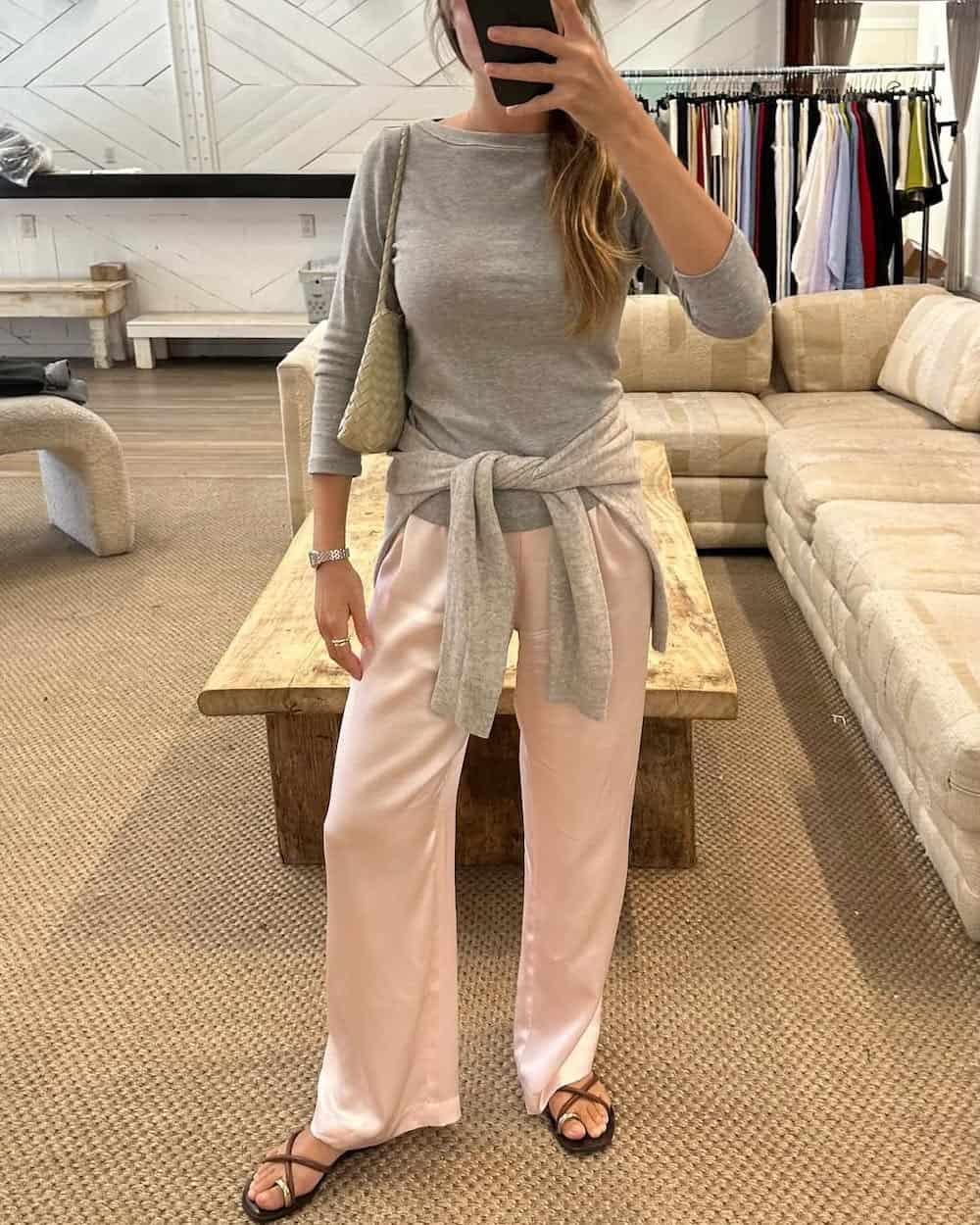Satin pants offer a luxurious aesthetic while providing exceptional comfort, making them a fantastic choice for all-day wear that doesn’t compromise on sophistication. Opting for a pastel shade, such as the soft pink featured here, lends the outfit a delicate, airy, and flirty appeal. When combined with a simple grey top, these satin pants create a beautiful balance between elegant and grounded pieces, ideal for a sophisticated yet comfortable look.
