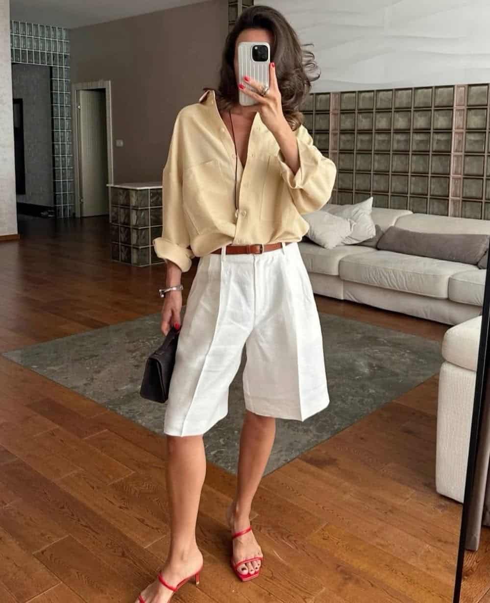 To achieve a look that is modern, minimal, and exceptionally chic, consider investing in a pair of breezy Bermuda shorts. These shorts offer a polished yet seasonally appropriate option, pairing beautifully with a butter-yellow button-down shirt. This tailored yet relaxed outfit is suitable for casual celebrations, creative work environments, and early evening dinners. Incorporating red shoes adds a playful burst of color, while simple, strappy heels enhance the overall summery feel.