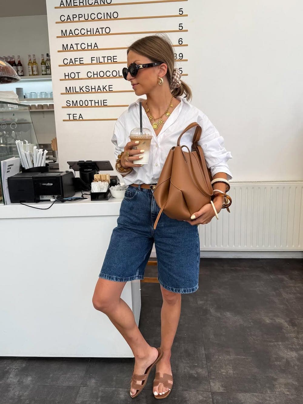 Denim Bermuda shorts, an airy ivory button-up shirt, and cognac-colored accessories combine to create a modern, elevated bohemian aesthetic that is particularly suited for June. This outfit strikes a perfect balance between a relaxed feel and refined style, making it ideal for browsing local shops and markets in the city while enjoying a refreshing iced latte.