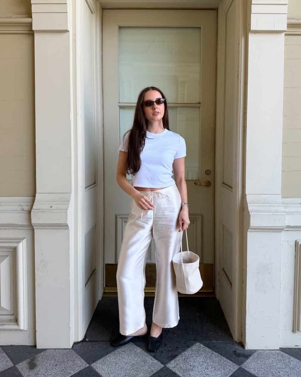 Styling satin drawstring pants with a simple white t-shirt presents an understated yet chic combination. The subtle sheen of the ivory satin bottoms adds a touch of luxury, and the overall pairing feels elevated without appearing overdone. Finishing the look with black slide sandals and a structured bucket bag creates a sophisticated June outfit suitable for travel days, casual evenings out, or relaxed lunch dates.