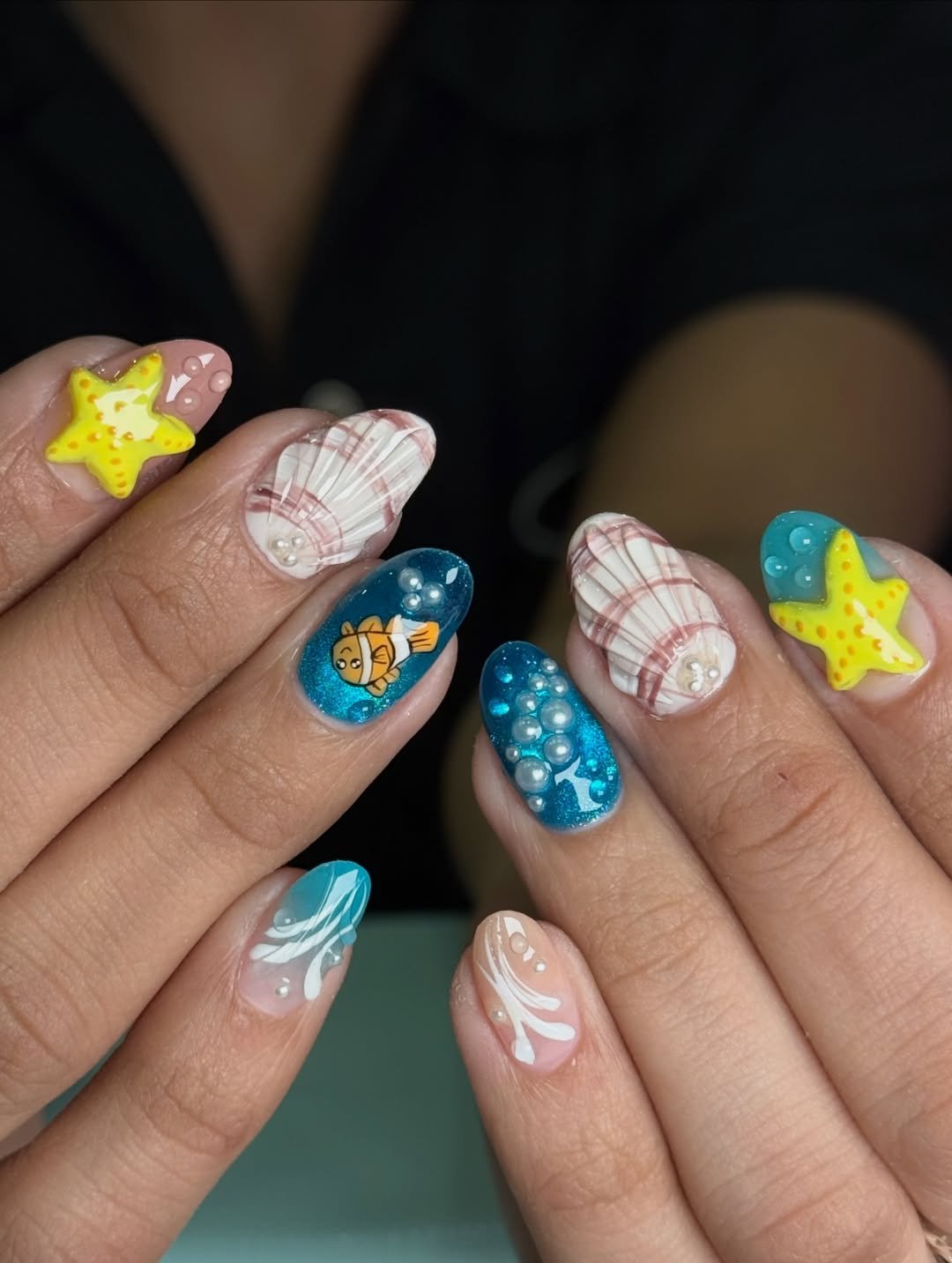 These nails exude a vibrant, playful beach energy. Bright yellow starfish, textured seashells, and a tiny clownfish inhabit sparkling blue backgrounds, forming a miniature underwater world on the fingertips.