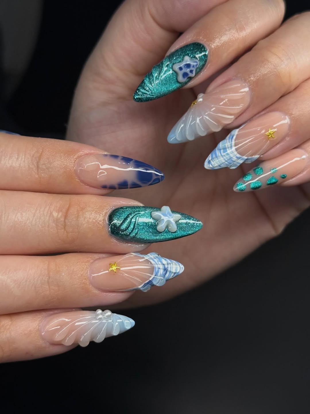 This design delves into deeper, more intense ocean tones. Shimmering teal polish, intricately sculpted shell patterns, and delicate starfish accents come together to form a bold yet elegant underwater-inspired manicure.