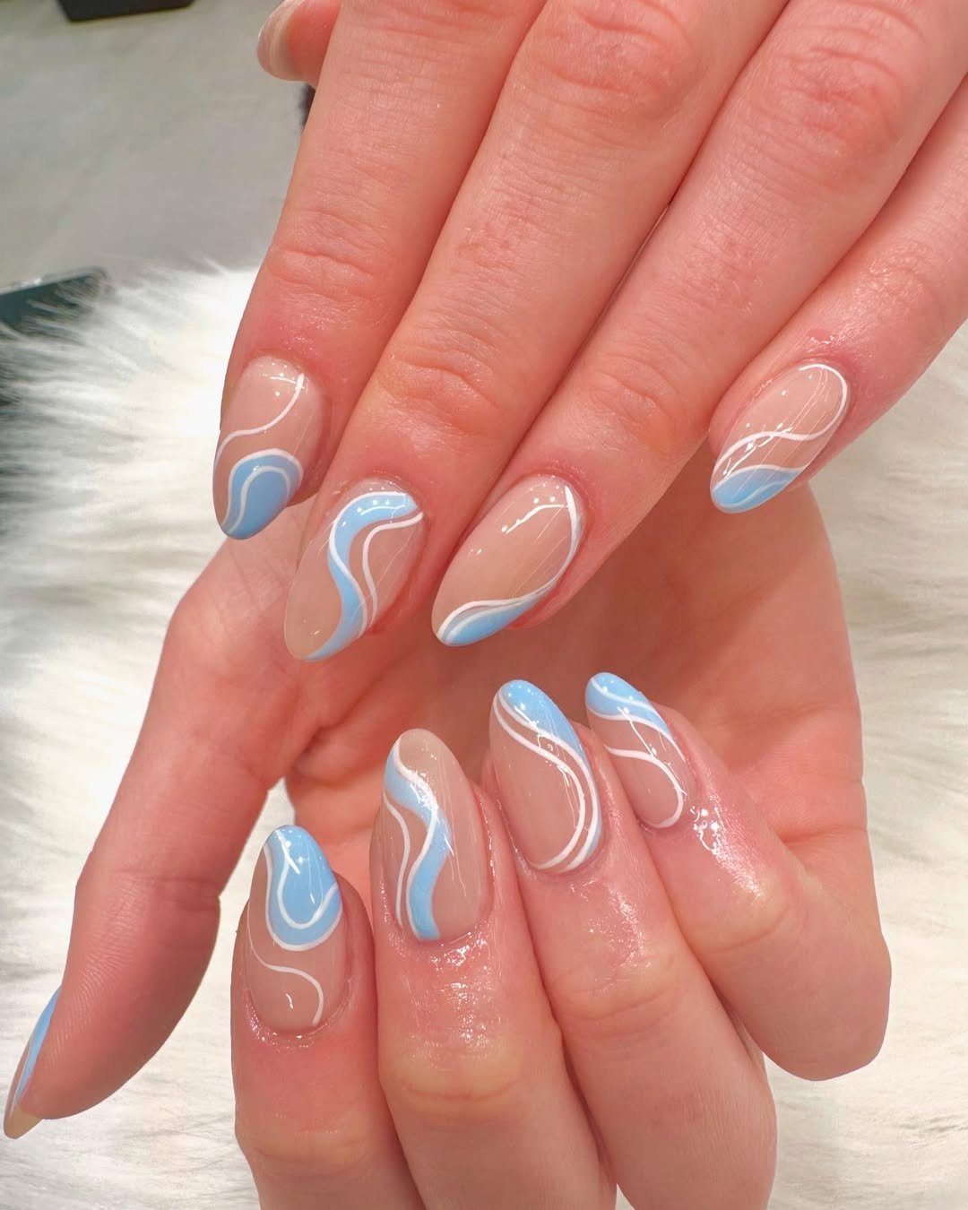 Embracing a minimalist interpretation of the ocean theme, these nails feature soft blue and white lines that flow across a natural nude base, ingeniously creating the visual impression of gentle waves receding from the shore.