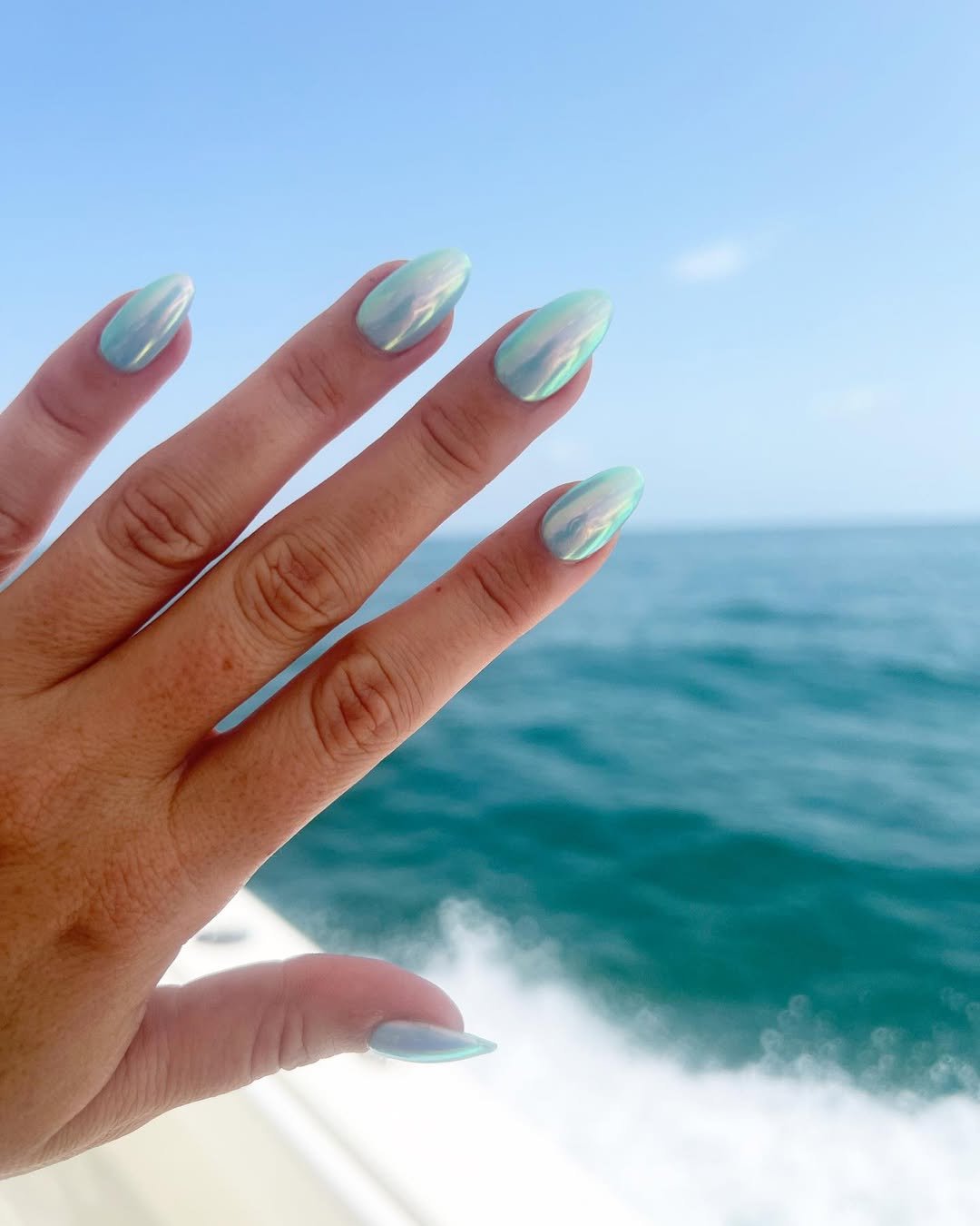 Achieving an ocean theme can be elegantly simple. These nails feature a captivating iridescent chrome finish that shifts through seafoam green, pale blue, and soft pearl tones depending on the angle of the light.