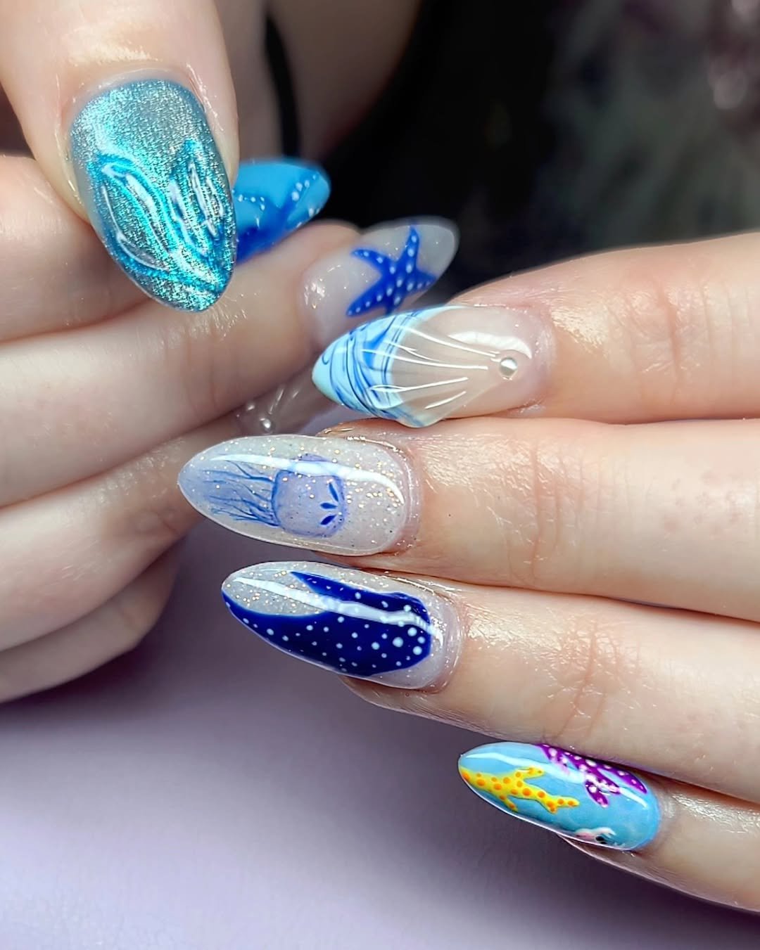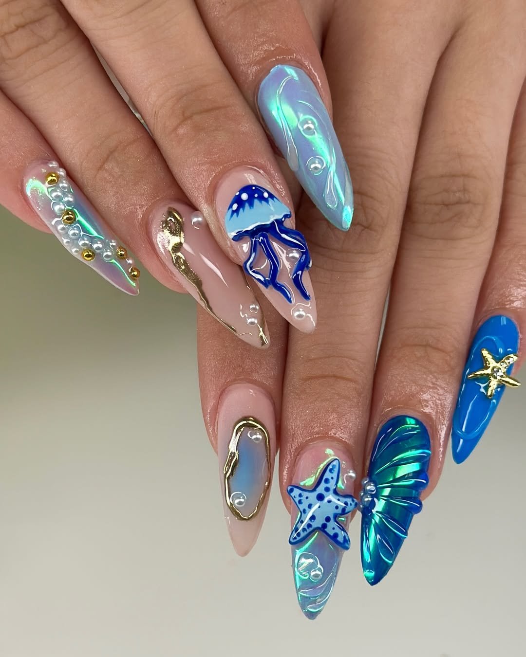 This set invites you on a full underwater expedition. Starfish, seashells, jellyfish, and shimmering blue hues are integrated across the nails, forming a vibrant, ocean-themed masterpiece.