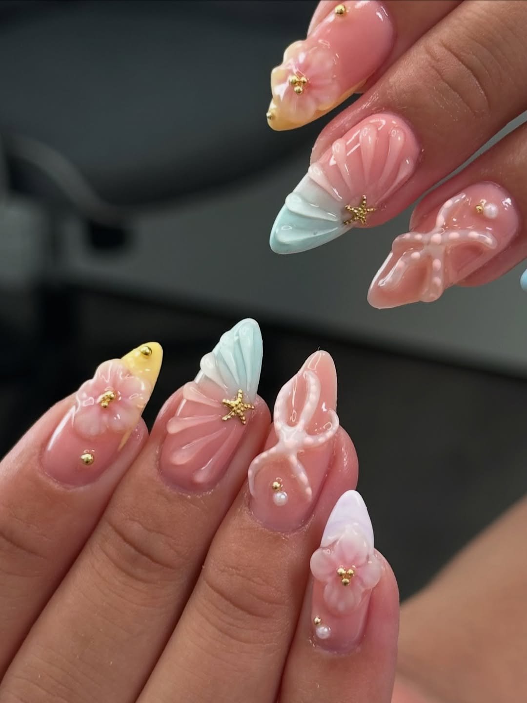 This collection of nails evokes the feeling of discovering treasures from a mermaid’s trove. Sculpted shell textures, glossy starfish details, and muted pastel tips combine to create a dreamy underwater aesthetic that is both delicate and magical.