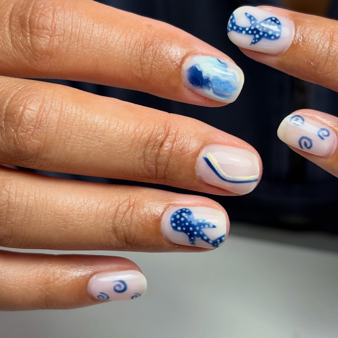 This manicure offers a charmingly casual take on ocean motifs. Starfish, wave patterns, swirls, and dotted accents are playfully arranged on a soft, milky base, contributing to a relaxed beach-ready look.