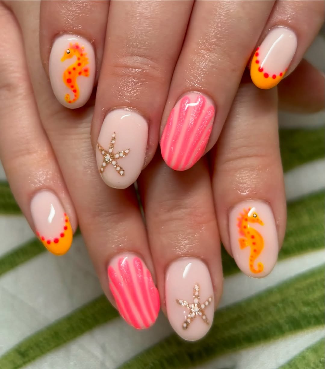 This manicure masterfully blends oceanic inspiration with bold summer color choices. Vibrant coral pink and sunny orange details are set against a soft nude base, while miniature seahorses and starfish introduce the sea-life theme.