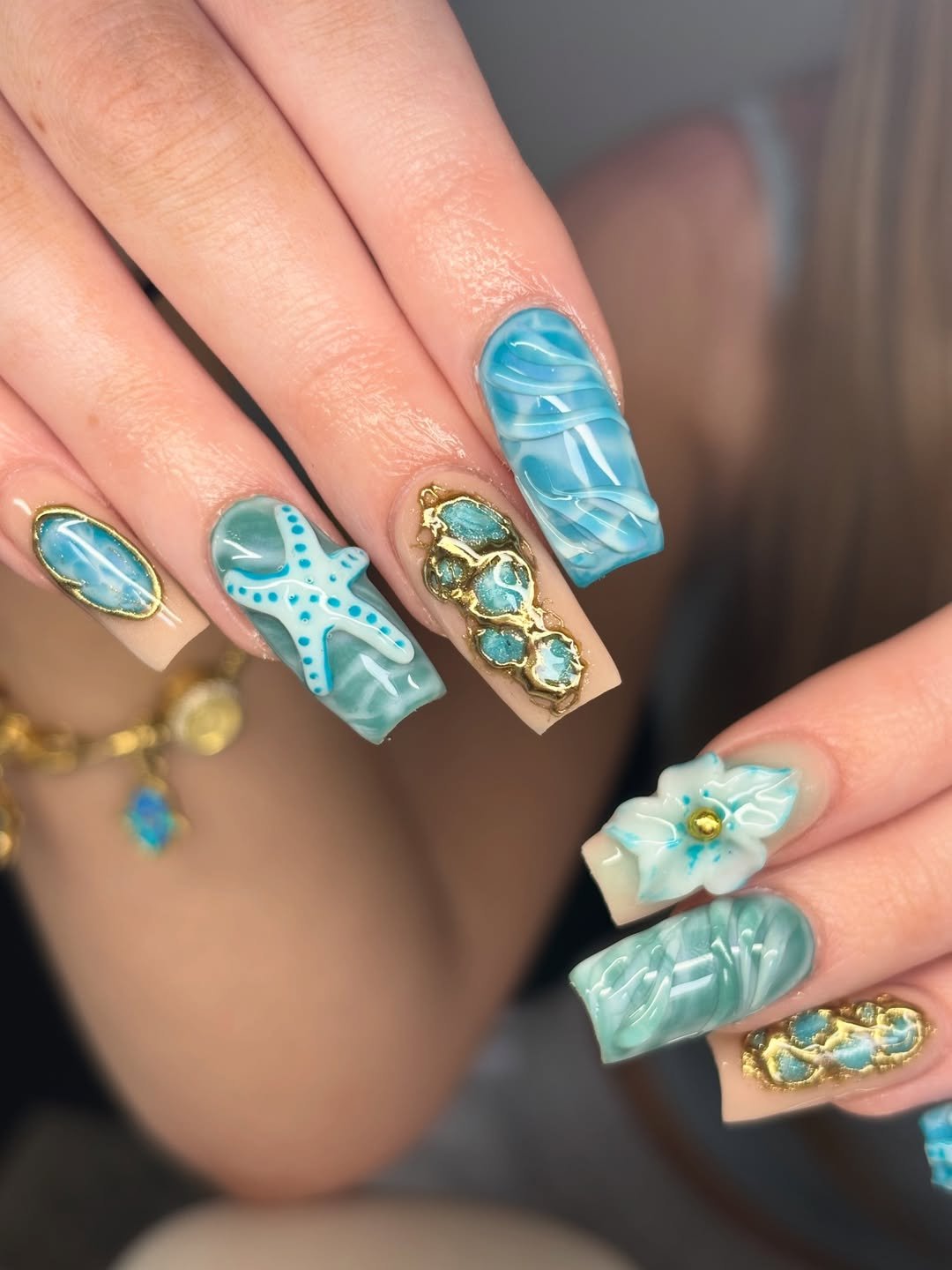 These nails offer a treasure trove of underwater allure. Teal marble patterns, metallic gold outlines, and sculpted starfish elements converge to produce a design that is both rich and artistically sophisticated.