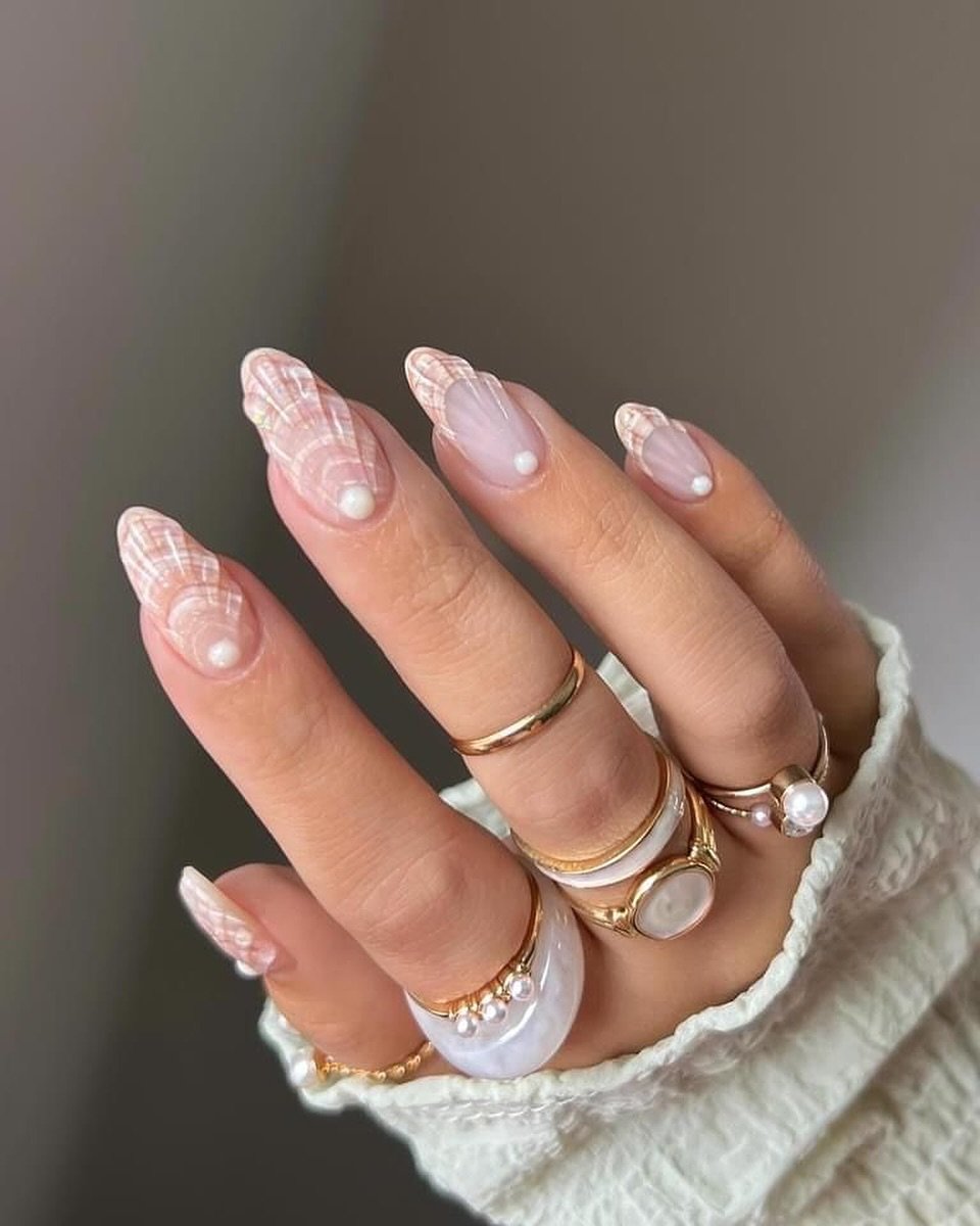 This manicure possesses an elegance reminiscent of delicate coastal jewelry. Soft pink tones, shell-inspired textures, and subtle pearl embellishments contribute to a look that is tender, feminine, and inherently beachy.