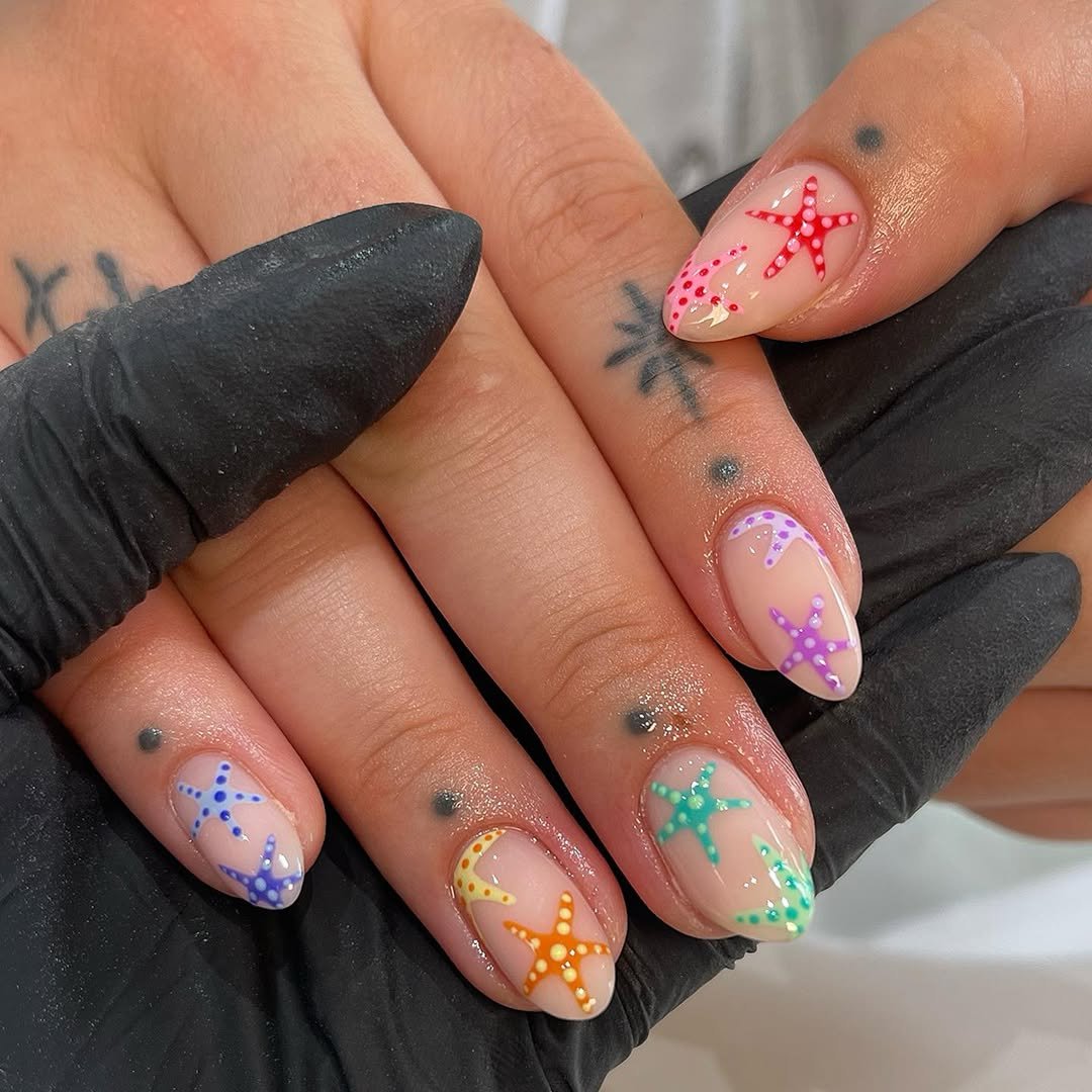 These nails offer a delightful pop of color reminiscent of a playful tide pool. A clean, soft nude serves as the canvas, while a scattering of dotted starfish in various bright colors injects a cheerful, beach-day vibe.