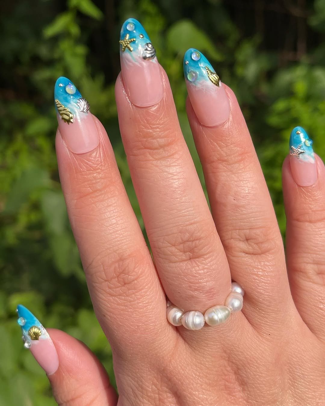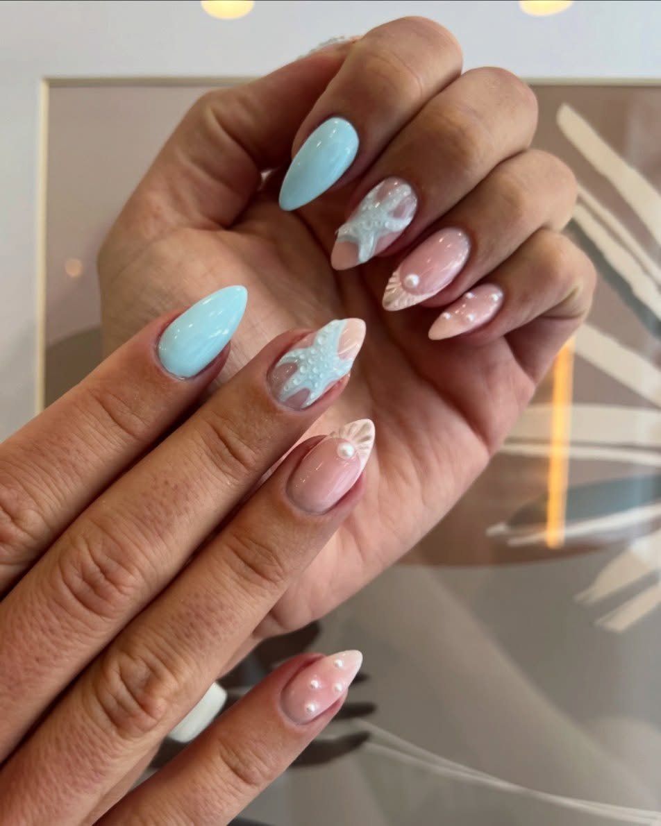 This set beautifully reflects the soft iridescence of sunlight dancing on water. Pale blues, glossy nude foundations, and delicate shell textures combine to create an elegant, beach-inspired manicure that feels refined and polished.