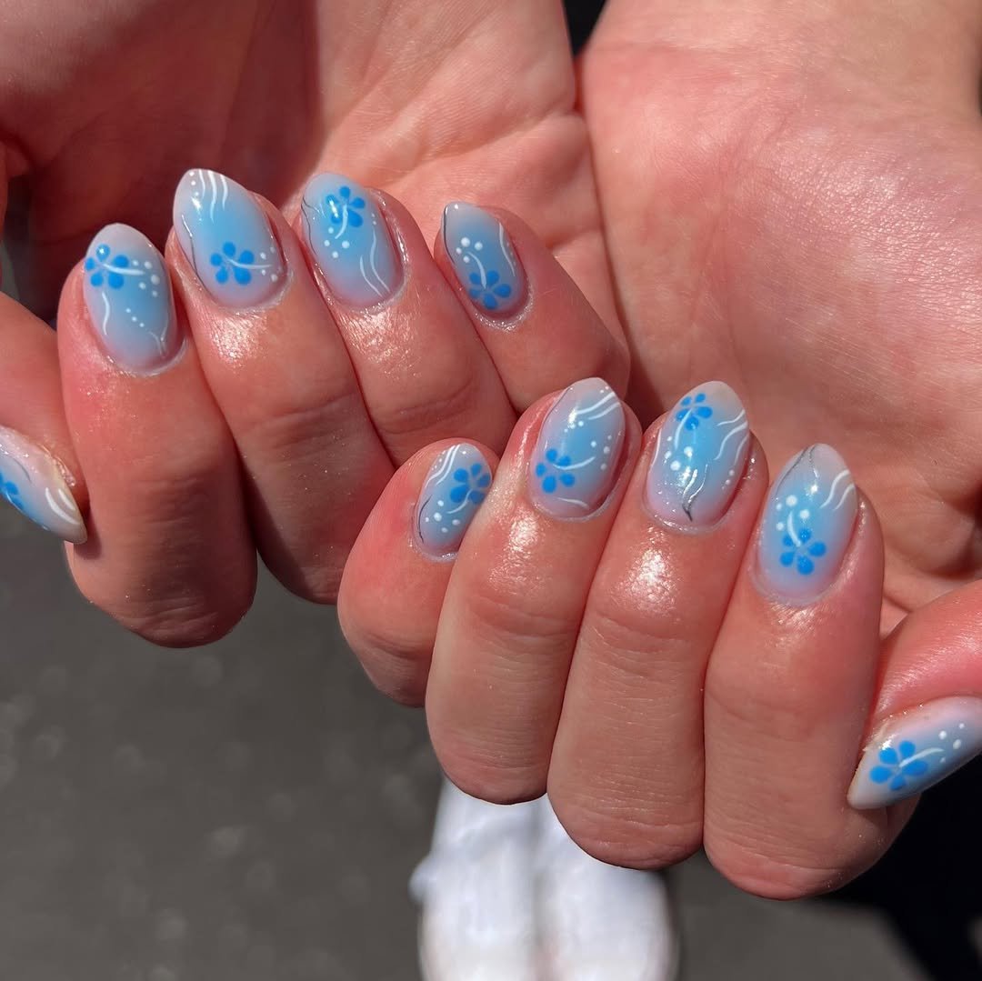 These nails evoke the feeling of a gentle ocean breeze on a bright, clear day. Soft blue gradients transition into a milky base, complemented by delicate floral and swirl patterns that add an airy, light touch.