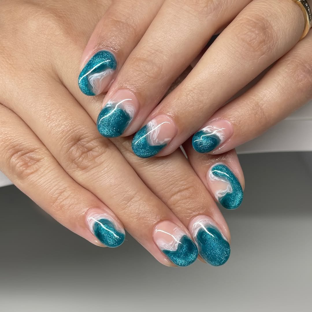 These nails brilliantly capture the dynamic motion of ocean waves. A rich, teal shimmer flows in gentle curves across the nails, harmonizing with milky white accents that artfully represent sea foam.