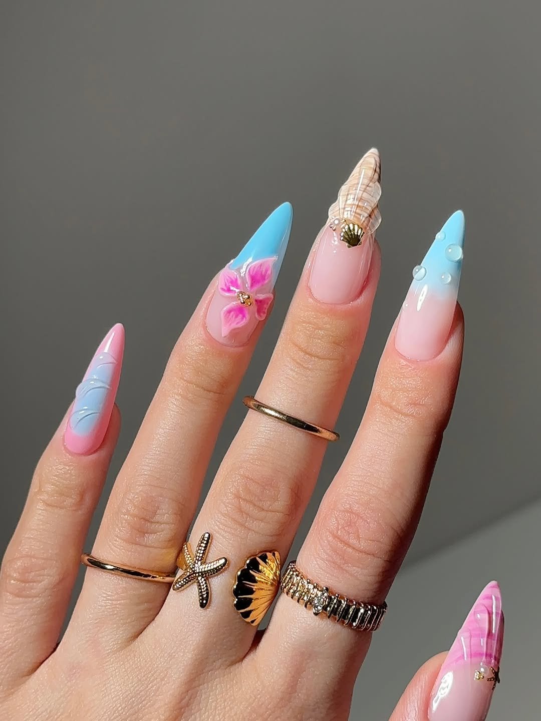 These nails capture the enchanting ambiance of a tropical beach sunset. A soft gradient transitioning from blue to pink flows across the nails, accented by floral motifs and shell textures that add a playful, exotic charm.