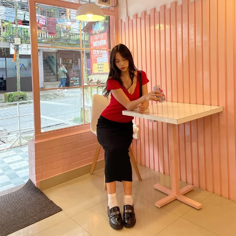 A fitted red top paired with a sleek black midi skirt offers a timeless appeal. This combination carries a sense of old-school romance, especially when accessorized with loafers and crisp socks.