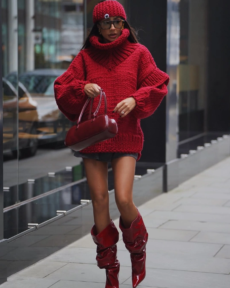An oversized, hand-knitted red sweater offers a profound sense of comfort. Paired simply with boots and minimal layering, it exudes an authentic coziness.