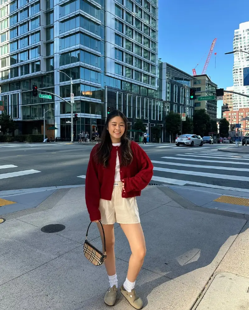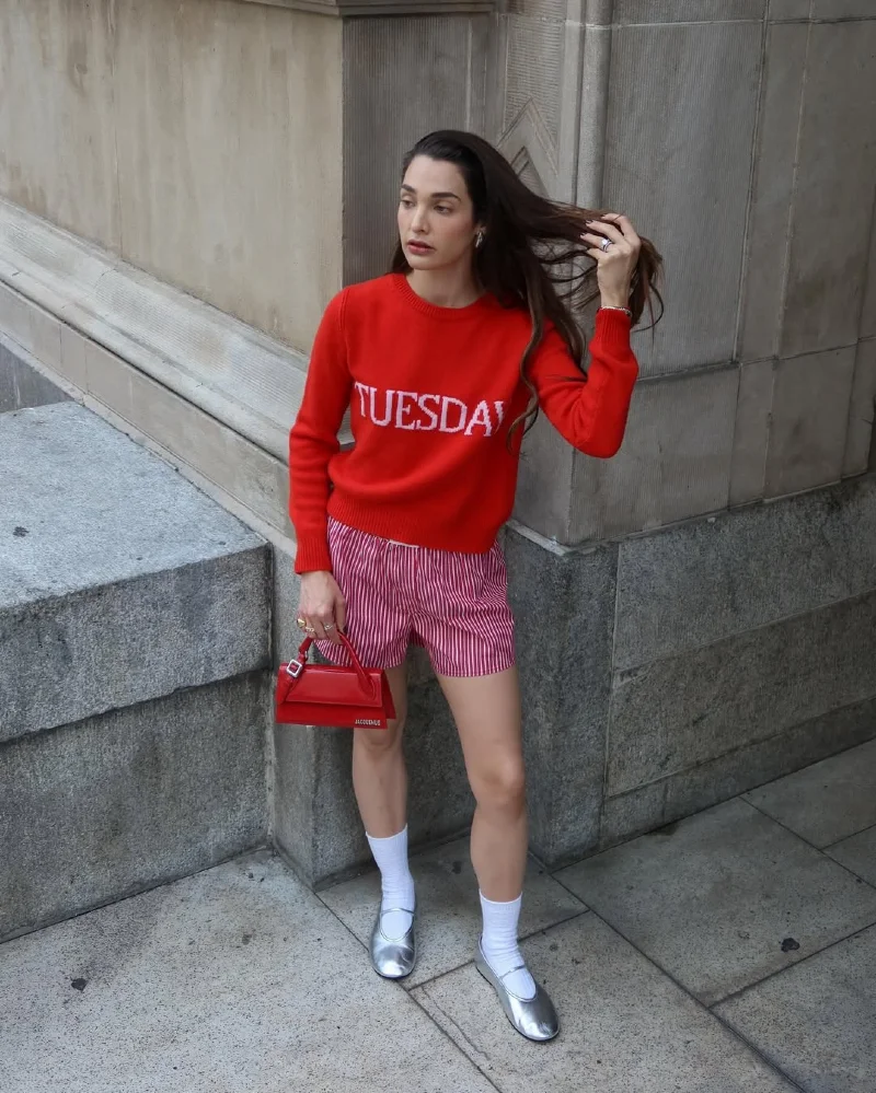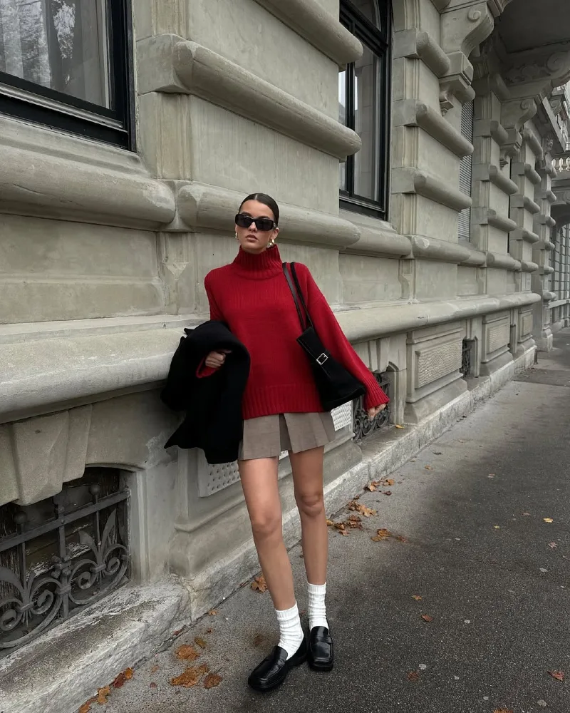 This look effortlessly embraces modern prep sensibilities. A chunky red turtleneck paired with tailored shorts presents a fresh, confident, and street-style-approved combination.