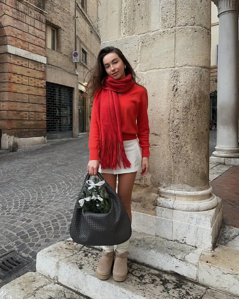 There’s an undeniable classic appeal to a vibrant red sweater set against traditional stone architecture. When paired with a sharp white mini skirt and comfortable boots, the ensemble strikes a festive chord without appearing overdone, evoking the charm of a spontaneous winter photoshoot during a leisurely stroll.