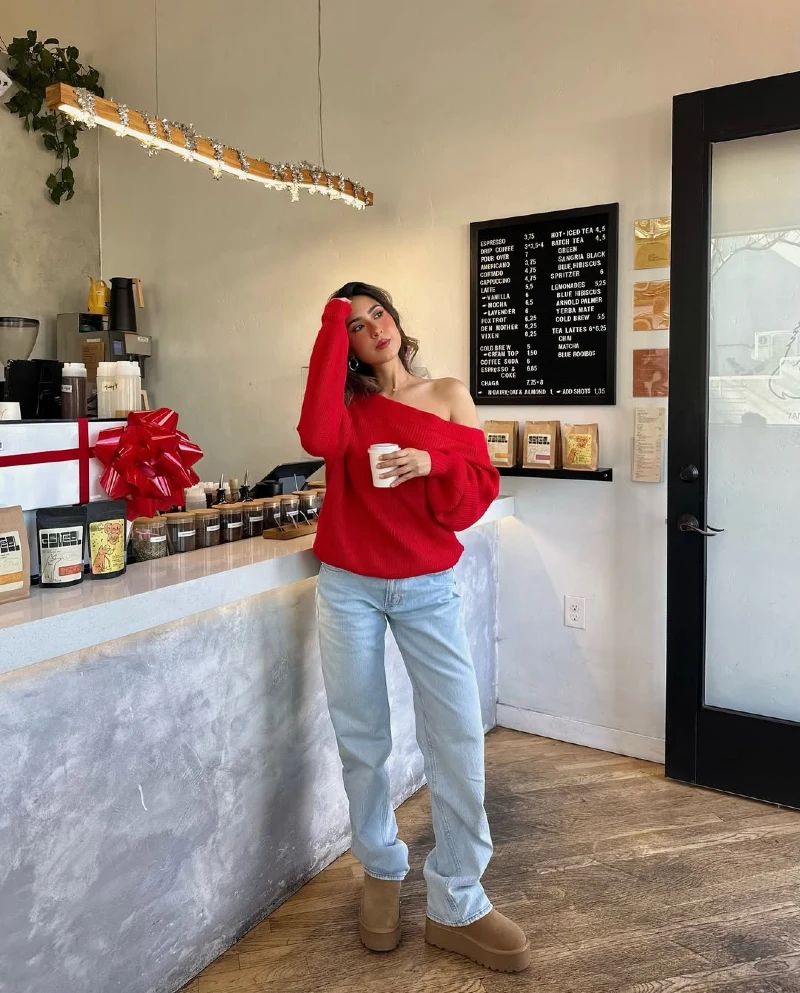An off-shoulder red sweater paired with light denim creates a relaxed and intimate feel, perfect for leisurely café afternoons. The gentle drape adds an ideal touch of ease.