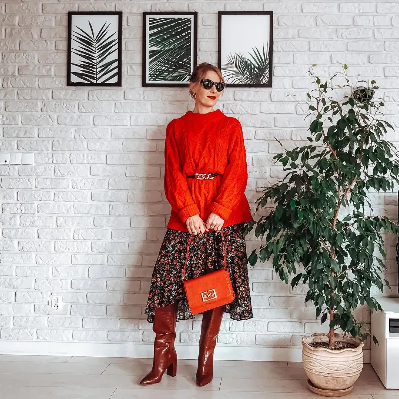 This particular look elegantly demonstrates that red can be both invitingly warm and impeccably refined. The textured sweater, subtly cinched at the waist, harmonizes beautifully with a flowing floral skirt and sleek boots, creating a balanced and appealing silhouette.