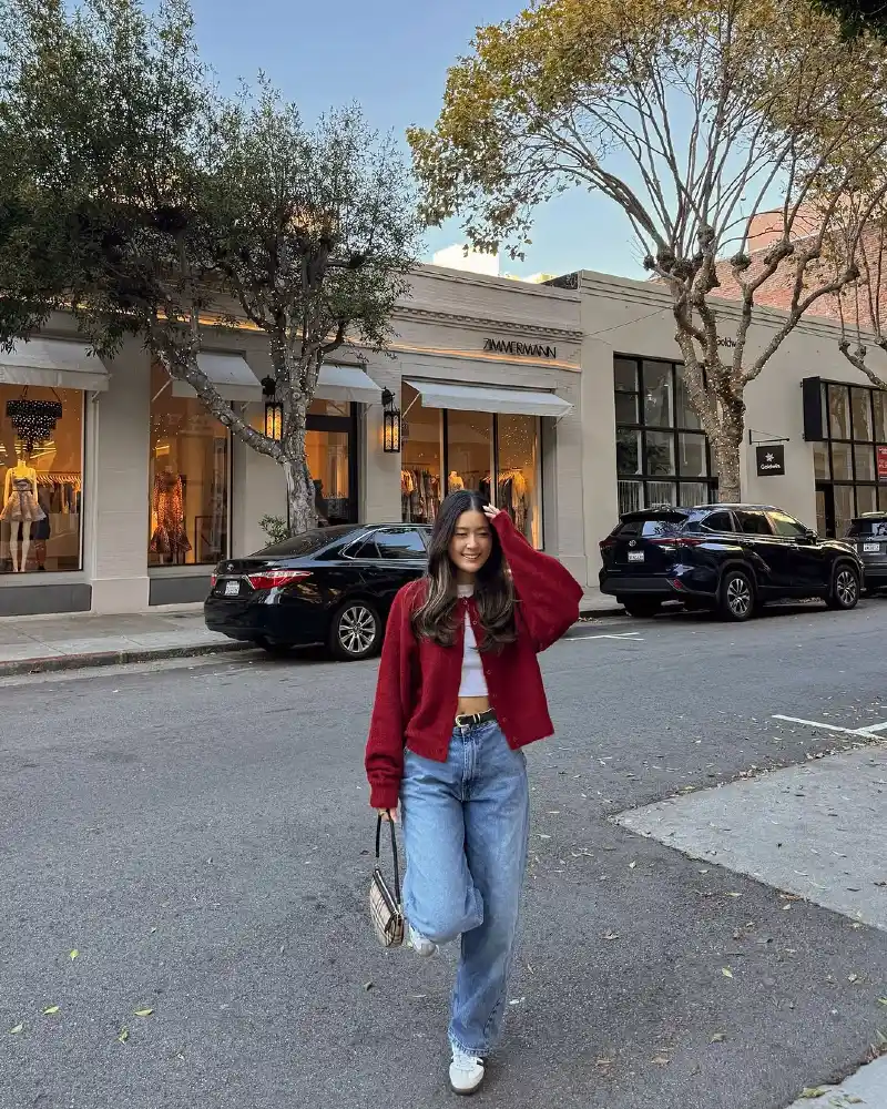 A cropped red cardigan worn with relaxed jeans exudes a youthful and effortless charm. It’s an approachable and highly wearable casual option.
