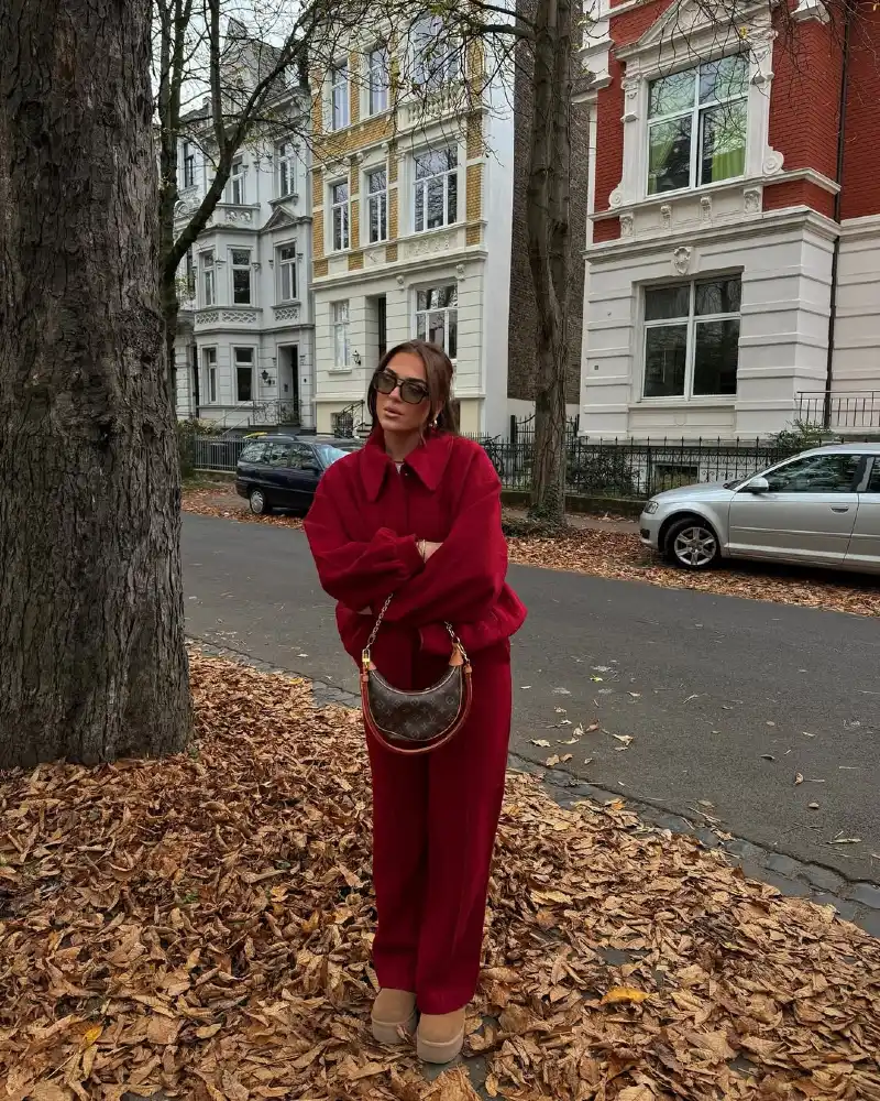 This outfit underscores that red doesn’t always need to make a bold statement; it can also contribute to a calm, cozy, and familiar aesthetic.