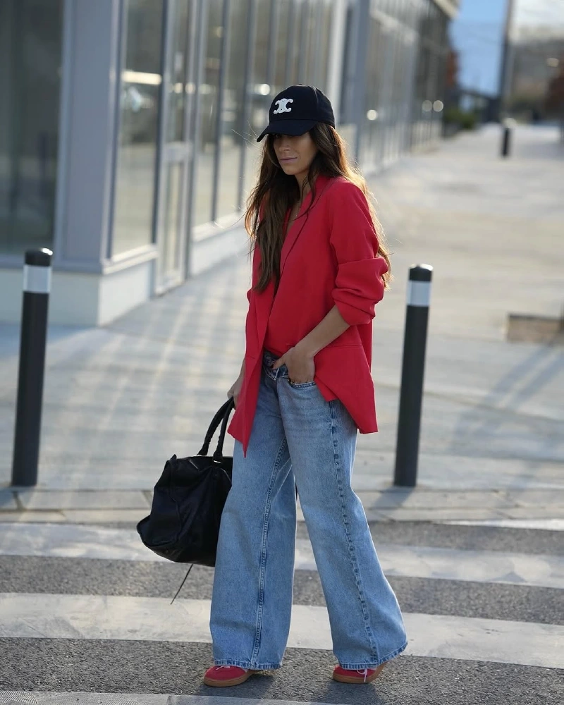 A red sweater paired with casually relaxed denim offers a distinct and appealing vibe. When complemented by a stylish cap and a slouchy bag, the outfit instantly achieves a modern, laid-back, and contemporary feel.