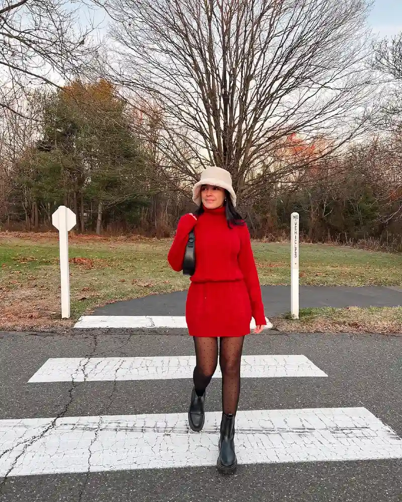 This outfit evokes a confident stride, perfect for the autumn season. A red sweater dress paired with sheer tights and chunky boots maintains a playful yet grounded aesthetic, striking a balance between cute and chic.