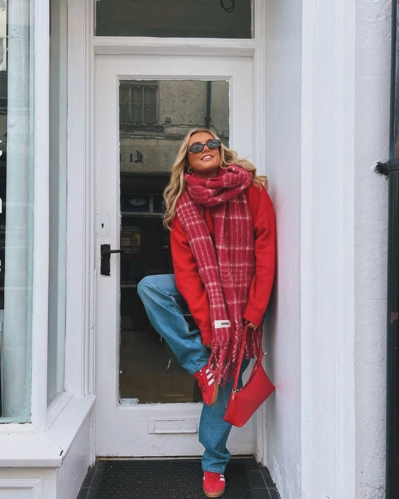 This outfit provides a sense of calm and ease. A chunky red sweater layered with denim and a scarf offers that sought-after relaxed, lived-in feel perfect for leisurely weekend days.