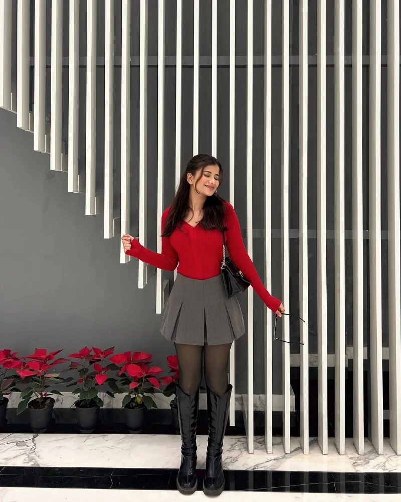 This ensemble radiates a quiet confidence, the kind that turns heads effortlessly without trying. The fitted red sweater provides the perfect amount of warmth and romance, beautifully complemented by a pleated grey mini skirt that adds movement without overshadowing the main piece. It offers a blend of playfulness and polish, ideal for embodying a “main character” vibe while navigating a modern setting.