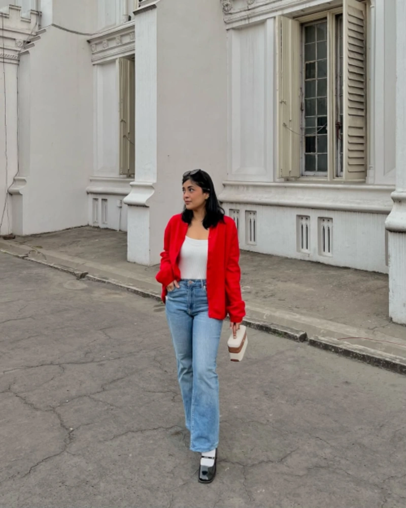 Here, red injects a playful and contemporary feel against an urban backdrop. Combined with light layers and comfortable footwear, it captures that desirable “on-the-go but still stylish” energy.